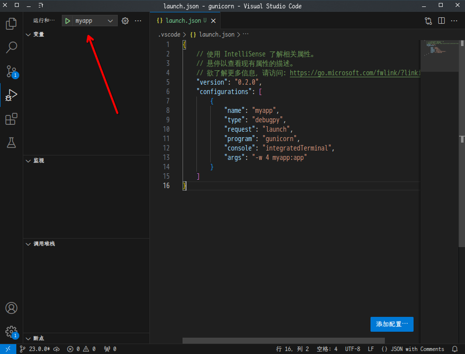 保存后在 vscode 的左上角就能看到我们刚刚添加的调试配置,如图: