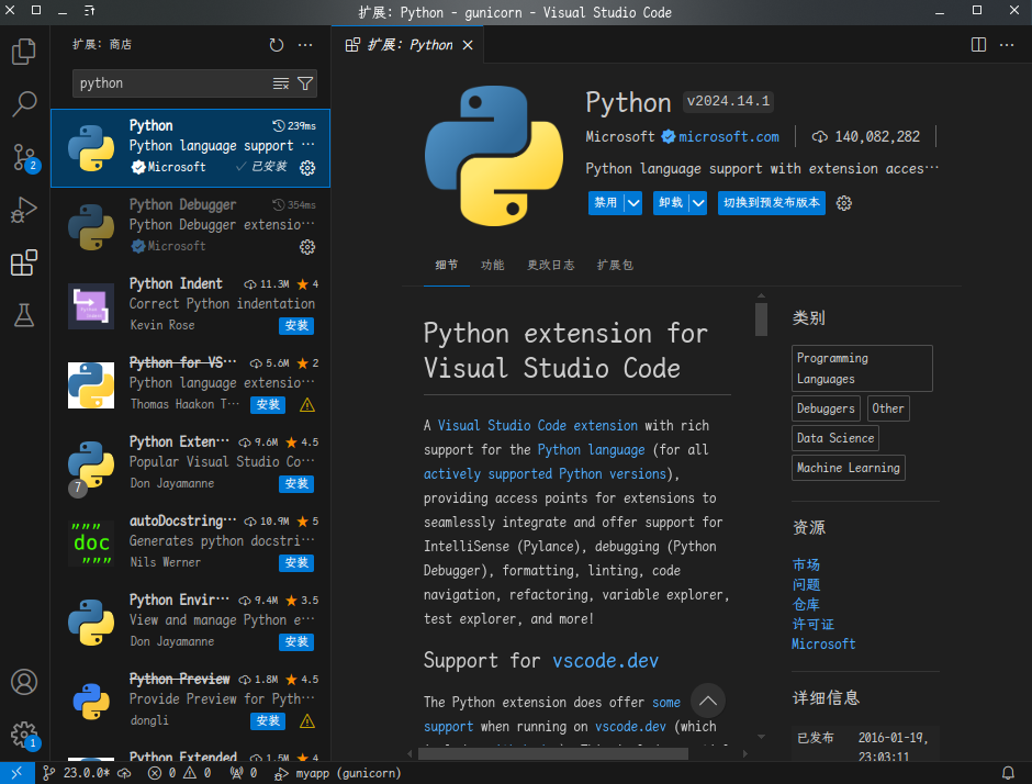 点击 vscode 左侧边栏的扩展按钮,在搜索框中搜索 python,安装微软官方提供的 python 插件。或者浏览器访问扩展地址,点击安装按钮或按步骤安装该插件。