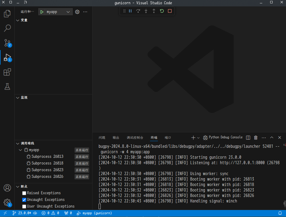 如图,上方中心位置是调试控制按钮,可以点着拖动到合适位置,左下角可以看到有 4 个子进程在运行,下方终端中也能看到启动了 4 个 worker 进程。